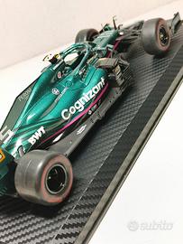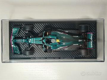 Modellino F1 in scala 1:24 della Aston Martin AMR21 di Sebastian Vettel del 2021. Viene venduta con teca in plexiglass, come da foto. La basetta è stata personalizzata con un vinile a trama fibra di carbonio, ed è stata applicata una targhetta informativa con modello, pilota, anno e Gran Premio; è comunque possibile tornare alla basetta originale semplicemente togliendo il vinile. Per altre foto o maggiori informazioni non esitate a contattarmi. Possibilità di consegna a mano a Roma (scrivetemi in privato per accordarci).