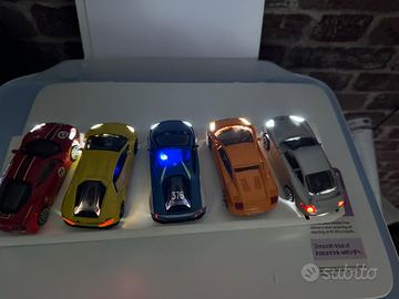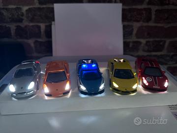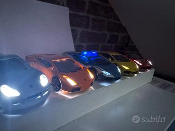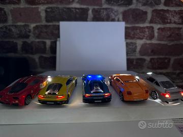 1/43 5 modellini supercar con luci Avanti, non tutteanche posteriori, solo 3 su 5 e la Lamborghini della polizia ha anche i lampeggianti funzionananti. DIORAMA con base di legno con sotto interruttore on/off, sopra 3 Lamborghini, 1 porsche, 1ferrari, al buio e molto luminoso. Alcuni modellini presentano in alcuni punti graffi.