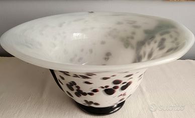 Una ricercatissima coppa in vetro soffiato di Empoli, a marchio “Griffe by Vetrerie di Empoli”realizzata con vetro spesso a effetto maculato e manici neri, dalle forme irregolari, produzione degli anni 1990.