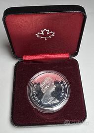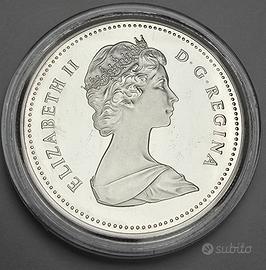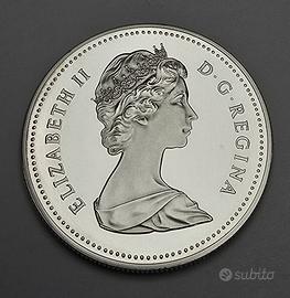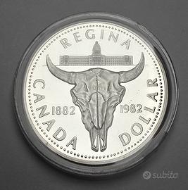 1 Dollaro d'Argento 0.500 coniato ad Ottawa in Canada per il 100° anniversario - Regina, capoluogo del Saskatchewan nel 1982. Da un lato la Regina Elisabetta II su disegno di Arnold Machin e sull'altro il simbolo della città disegnato da Walter Ott, Huntley Brown. La moneta ha un dimatro di 36 mm, uno spessore di 2,84 ed un peso di 23,32 grammi circa.