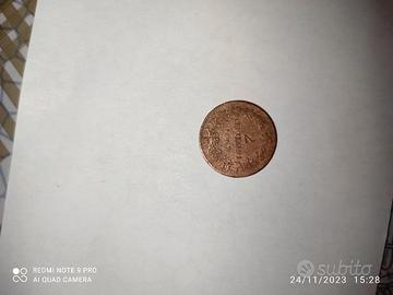 Zecca di Milano 99% rame, raffigura da un lato Vittorio Emanuele II re d' Italia (padre della patria) dall' altro corona di ulivo e ramo di quercia con foglie e una stella a 5 punte con raggi in cima. La moneta nonostante la sua età si presenta in condizioni accettabili, è leggibile e si vende nello stato di cui si trova, come in foto.