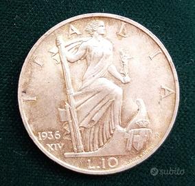 10 lire "Impero" del 1936 Vittorio Emanuele III, argento 835 peso 10 g, rif. catalogo "Gigante n° 64, condizione Fdc-, catalogata "C" (comune).