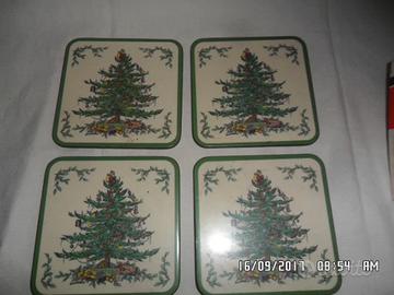 I sottobicchieri sono di forma quadrata con angoli stondati, raffigurano un albero di Natale addobbato con doni a terra, lo sfondo è color avorio chiaro con rifilettatura in verde abete