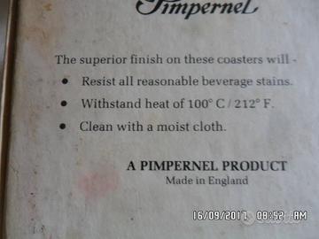 Più in basso si trova una fascia di colore rosso con scritta incorniciata "PIMPERNEL", e sotto in nero rifilettato "DE LUXE FINISH", su un lato un fiore, la scritta "SIX COASTERS" e i codici