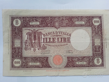 Contro luce le scritte banca d italia lire 1000 e la fanciulla con corona muraria personaficazione nazionale dell italia ( italia turrita ! ) .