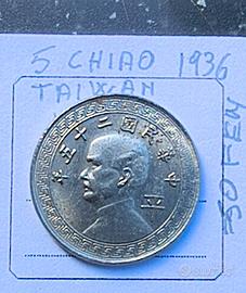 Pezzo Storico: 1 moneta da 5 Chiao del 1936 (Repubblica di Cina - Taiwan) con ritratto di Sun Yat-sen.