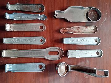 Lotto di 11 vecchi apribottiglie / cavatappi pubblicitari di varie Marche di "acqua minerale" vintage, alcuni di non facile reperibilità. Buone condizioni generali, solo "Lurisia" e soprattutto "acqua minerale Castello di Vallio" hanno qualche piccola macchia superficiale di ruggine ( vedi foto).