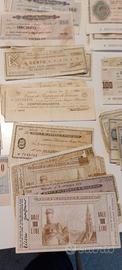 Vendo 110 mini assegni di diverso taglio e di numerose banche (per lo più oggi non più esistenti) alcuni in perfette condizioni e banconota di una lira “Luogotenenza” del 1944 in discrete condizioni.