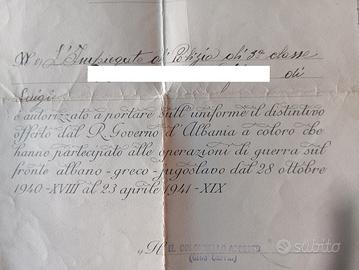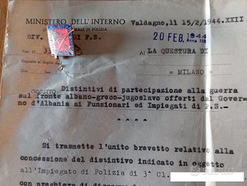 Vendo bellissimo & ormai raro documento con distintivo inerente la partecipazione alla guerra sul fronte Albano/Greco/Jugoslavo, con data 15 Febbraio 1944 ed in ottime condizioni generali (vedi foto). Spese di spedizione a carico di chi acquista.
