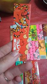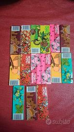 14 confezioni rettangolari. del marchio "Moon" Fragola (Strawberry): Confezioni di colore rosa con un personaggio che beve da una cannuccia. (4 pezzi) Mela (Apple): Confezioni di colore rosso con l'illustrazione di un serpente. (3 pezzi) Banana: Confezioni di colore giallo neon/verde con scimmie e palme. (2 pezzi) Arancia/Agrumi: Confezioni di colore arancione/giallo con spicchi di frutta. (2 pezzi) Cioccolato/Tabacco: Confezioni marrone scuro con grafiche che ricordano il cioccolato fuso o un cono gelato. (3 pezzi) Menta/Gusto Fresco: Confezioni azzurre/teal con l'illustrazione di un geco o una rana verde. (2 pezzi)