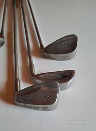 18 mazze da golf vintage con sacca in pelle e palline assortite.