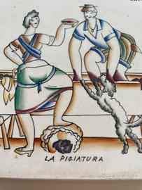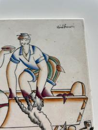 181 - GIO PONTI RICHARD GINORI S. CRISTOFORO FAMOSA MATTONELLA FIRMATA GIO PONTI RAFFIGURANTE “LA PIGIATURA” DELLA SERIE LA VENDEMMIA - ANNI 30. DIMENSIONE 14,5 x 14,5 cm.