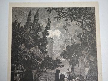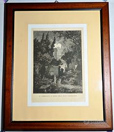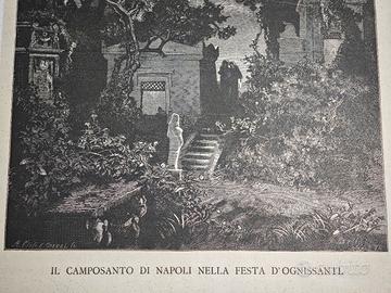 Incisione del 1874 intitolata "Il Camposanto di Napoli nella festa d'Ognissanti". L'opera ritrae un momento di profonda devozione presso il Cimitero di Poggioreale, il principale camposanto della città. Contesto Storico e Culturale: A Napoli, la festività di Ognissanti (1° novembre) e la successiva Commemorazione dei Defunti (2 novembre) rappresentano momenti di fortissimo legame tra il mondo dei vivi e quello dei morti. L'atmosfera: L'incisione cattura l'estetica romantica e malinconica tipica dell'epoca del Grand Tour , con una vegetazione fitta (cipressi e arbusti) che avvolge monumenti funebri e statue.La tradizione: Storicamente, durante queste giornate, migliaia di napoletani si recavano al cimitero non solo per la preghiera, ma per un vero e proprio rito collettivo di memoria, ornando le tombe con fiori e lumi.Il culto: Napoli è celebre per il suo rapporto unico con la morte (si pensi al culto delle "anime pezzentelle"), dove il confine tra i due mondi è percepito come sottile e quotidiano. Autori: È stata realizzata dagli artisti Adolf Closs e Carl Goebel, attivi nella seconda metà del XIX secolo. Cornice50x41cm Stampa32x23cm.