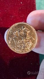 Questa moneta è una Sterlina d'oro (Sovereign) del 1899, coniata durante il regno della Regina Vittoria. Il rovescio presenta il celebre disegno dell'incisore italiano Benedetto Pistrucci, che raffigura San Giorgio a cavallo mentre uccide il drago. Caratteristiche Principali: Soggetto: San Giorgio e il drago Data di emissione: 1899 Materiale: oro a 22 carati Incisore: Benedetto Pistrucci (indicato dalle iniziali B.P. sopra la data). Sterlina d'oro (Sovereign): Composta da oro 0.917, con un peso di circa 7,98 g.