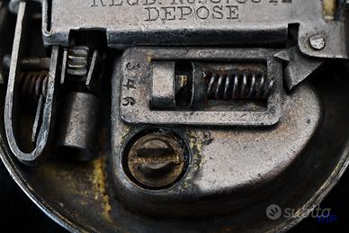 Rarissimo accendisigari "Champion" prodotto da Emil Deutsch, in Germania, dal 1911, a forma e dimensioni di un comune, per l'epoca, orologio da tasca. Costruzione in ottone cromato. Il marchio E\*/D è inciso sul cestello porta pietra focaia. Funziona con petrolio e stoppino. Il pomello di carica viene utilizzato per regolare lo stoppino. Il meccanismo si compone di ingranaggi e molle. Premendo il pomo di carica si apre a scatto la parte superiore che aziona la rotazione della ruota zigrinata che, a contatto con la pietra focaia, fa scoccare la scintilla. Una leva permette lo sgancio dell'altro lato della cassa, rivelando il meccanismo e permettendo la ricarica del combustibile e dello stoppino. Questo esemplare porta il numero di serie 346. Sulla parte anteriore del meccanismo vediamo "D.R.G.M. GES. GESCH "che indica il brevetto n° 573341 valido per tutta la Germania (precedentemente i brevetti erano per zone della Germania). Quindi "PATENT ANG." indica la protezione brevettuale britannica. Sempre sul meccanismo si legge "REGD No. 573341" e "DEPOSE" indicante il brevetto valido anche in Francia. Possibile spedizione tracciabile previo pagamento anticipato. Preferito ritiro a mano a Roma in zona Colli Aniene. Non rispondo a collezzionisti di foto, ribassisti e perditempo.