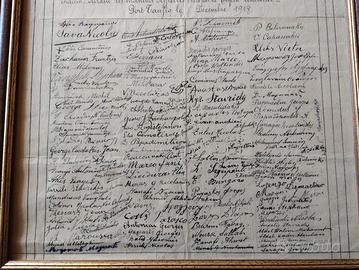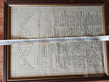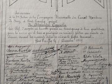 1918 Compagnia Universale del Canale di Suez di Port Taufiq Attestato gratitudine al loro Capo Alexandre Coppola firmato da tutti i componenti della 3^ sezione durante la prima guerra mondiale, misure in foto completo di cornice, come da foto.