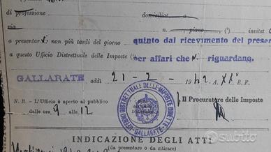 Varese, ufficio delle imposte di Gallarate, anno 1942 ( timbratura dell' ufficio distrettuale delle imposte dirette, con fascio littorio) . Un pezzetto di storia del Varesotto e dell'aviazione Italiana.