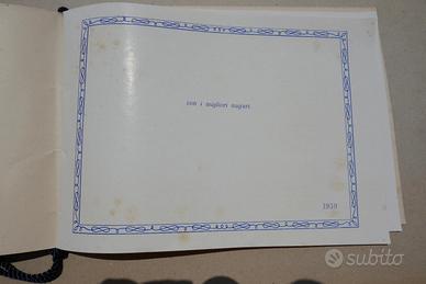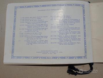 1959 Calendario Unione Monarchica Italiana Reali Savoia in esilio RE UMBERTO II - Re di Maggio. Fascicolo di 8 pagine (4 di coperta di carta forte e 4 di carta sottile patinata con cornice a nodi di Savoia blu), sciolte, non numerate, tenute assieme al dorso da cordoncino colorato in seta con nappina, formato in oblungo 200x280 mm, con illustrazione alla coperta anteriore (ritraente Umberto II di Savoia, Maria Josè del Belgio e Maria Pia di Savoia). Cond.: Leggere tracce del tempo e piccole cadute di colore come da foto sul fronte. Peso: 50 g.