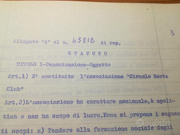 Raro Atto Notarile 1975 - Costituzione Circolo Hertz Club (CRAL) Storia del Lavoro e Welfare Aziendale Documento originale di 16 pagine in formato A4 del 19 maggio 1975, relativo alla costituzione formale del Circolo Hertz Club, il braccio sociale e ricreativo della celebre multinazionale di autonoleggio Hertz Italiana Atto di Costituzione dell'Associazione Redatto dal Notaio Statuto Integrale Dettagli su scopi sociali, struttura apolitica e senza scopo di lucro Copia Conforme Originale Datata 23 giugno 1975, completa di firme autografe, timbri a umido notarili e marche da bollo dell'epoca Contesto Storico - I CRAL negli Anni Settanta Questo documento non è solo una carta legale, ma la testimonianza di un cambiamento sociale dell'Italia degli anni '70 - In quel decennio, le grandi aziende (guidate da uffici delle Risorse Umane in evoluzione) iniziavano a strutturare i CRAL (Circoli Ricreativi Aziendali Lavoratori) Queste associazioni erano fondamentali per Il Welfare Aziendale Offrire ai dipendenti viaggi, colonie estive per i figli e attività sportive fuori dall'orario di lavoro L'Identità di Gruppo In un periodo di forti tensioni sociali e sindacali, il "Circolo" serviva a creare comunità e senso di appartenenza al brand (in questo caso, il prestigioso marchio Hertz) Gestione No-Profit Come si evince dall'Art. 2 dello statuto allegato, queste realtà operavano separatamente dal business commerciale per garantire benefici fiscali e trasparenza nella gestione dei servizi ai lavoratori Stato di conservazione buono o più Carta d'epoca con battitura a macchina originale (inchiostro blu/nero), ben leggibile Un pezzo immancabile per chi raccoglie oggetti legati alla storia di Hertz - Un esempio perfetto di come venivano redatti gli atti associativi prima dell'era digitale