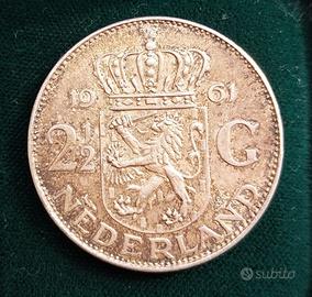Moneta da 2,5 Gulden raffigurante da regina Juliana di Olanda, anno 1961, argento 720, peso 15 g, conservazione Spl/Fdc