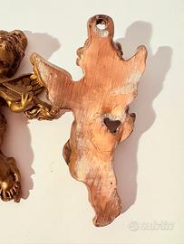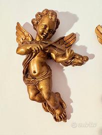Vendo raffinata coppia di angeli musicanti realizzati in legno finemente intagliato e rifiniti con una calda patinatura dorata. Le figure rappresentano due putti in volo, uno intento a suonare il violino e l'altro una tromba. Le sculture misurano rispettivamente 15 cm in altezza e 11 cm in larghezza, dimensioni perfette per arricchire una parete, decorare un angolo della casa in stile classico o essere inserite in una collezione di arte sacra e artigianato. Disponibile la spedizione o ritiro di persona.