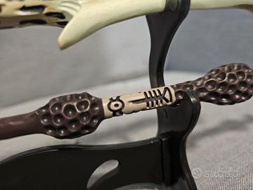 Vendo bellissimo set composto da - 1x Porta bacchette - 2x Bacchette (Voldemort e Silente) - 1x Ciondolo con collana dei Doni della morte Materiale bacchette: resina Materiale porta bacchette: plastica Bacchetta Silente Peso: 72 g circa Lunghezza: 41 cm Bacchetta Voldemort Peso: 82 g circa Lunghezza: 35,5 cm Ciondolo Peso : 4.4 gr Lunghezza catenina : 43 cm Altezza ciondolo: 25 mm Larghezza ciondolo: 30 mm