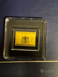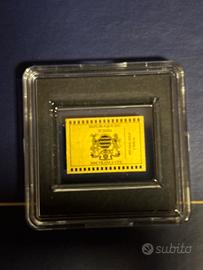 Vendo 2 blister lamine oro fino 999 24k con certificato di autenticità dimensioni 16.8x12 mm del peso ognuna di 1/1000 di oncia incorniciati singolarmente con una a rappresentare il miracolo economico e l’altra la riforma valutaria.