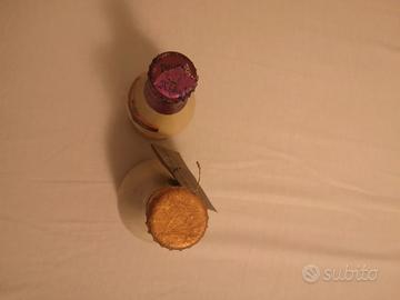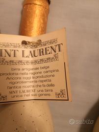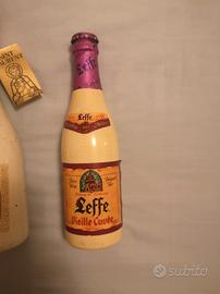 Due bottiglie di birra vuote, vetro smaltato effetto ceramica. Con tappo. Sint Lauren triple. Leffe Vieille cuvee