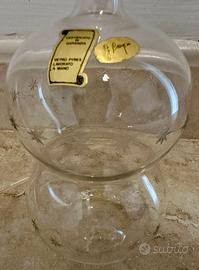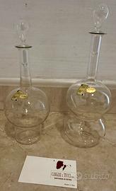 2 Bottiglie in vetro pirex con tappo Hand Made soffiate a bocca della soffieria Cangini e Tucci. Le bottiglie sono decorate con decori bianchi. Le bottiglie sono nuove, in ottimo stato recano il marchio e il certificato di garanzia del produttore. Hanno altezza 24 cm, diametro 6 cm. Saranno accuratamente imballate e spedite. Si assicura arrivo integro a destinazione