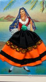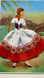 Vendo coppia di cartoline d'epoca originali anni '50/'60 della serie "vestite", dedicate alla Riviera Adriatica. Questi modelli sono particolarmente ricercati perché presentano sia la figura con abiti in tessuto che inserti fotografici dei paesaggi romagnoli/adriatici dell'epoca. Cartolina 1: Soggetto con gonna arancione e nera (inserti in raso e passamaneria dorata) affiancata da una suggestiva foto di un tramonto sul mare con barca a vela. Cartolina 2: Soggetto con gonna bianca e rossa (ricami dorati) affiancata da vedute panoramiche della riviera e locali tipici dell'epoca. Non viaggiate, retro bianco, mai scritte. Artista Elsi. per collezionisti di memorabilia balneare italiana o di cartoline artigianali vintage. Disponibile per consegna a mano.