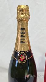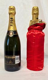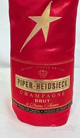 Bottiglia da collezione di uno Champagne Piper-Heidsieck Brut, caratterizzata da un distintivo rivestimento termico rosso (spesso chiamato Sleeve o Jacket, con una stella dorata. Piper-Heidsieck Brut fondata a Reims nel 1785. Si tratta di una confezione da collezione degli anni 2000, che include una custodia termica progettata per mantenere la bottiglia alla temperatura ideale di servizio. Le foto fanno parte della descrizione.