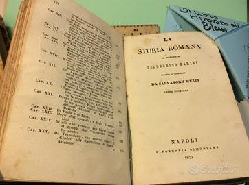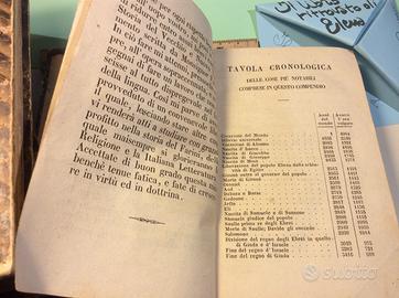 559-R Bis Picc. 2 Libri in uno: La Storia Sacra Ridotta a compendio dal prof. Gaetano Gibelli Seconda edizione della sesta Bolognese Assisi 1860 tip. Sgariglia Editrice. La storia Romana di Monsignor Pellegrino Farini Ridotta a compendio da Salvatore Muzzi Terza edizione Napoli Tipografia Simoniana 1859 Due Volumi rilegati in uno. Testo con dorso in piena pelle con fregi oro, piatti in cartonato rigido marmorizzato bicolore. Segni del tempo e uso come da foto. Innestato parzialmente il dorso con tela marrone, per rendere solida la struttura del libro. Nell'insieme ottimo volume. Pp 182 + 218 - In 16° altezza tra 15 e 20 cm Escluse spese di spedizione: Piego libri raccomandato (consigliato e preferito) ? 6. Pagamenti disponibili: PayPal, Bonifico Bancario e comuni forme postali.