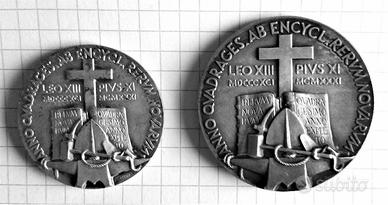 2 medaglie emesse nel corso del pontificato di Pio XI per il 40° della RERUM NOVARUM Metallo argentato conservazione splendida. Disegno di CORRADO MEZZANA 1: diam. 44 mm peso 41,3 g 2: diam. 37 mm peso 22,9 g