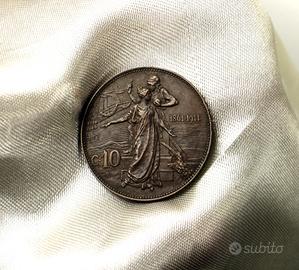 La facciata del rovescio, invece, presenta due figure. Una femminile che rappresenta l’Italia. Mentre l’altra, situata dietro la femmina e su un piedistallo, è maschile e simboleggia la città di Roma. Alla destra del piedistallo è presente un aratro con spighe e frutta, mentre in basso, verso sinistra, troviamo il valore nominale della moneta C.10 e subito sotto la lettera R che indica la Zecca di Roma. Sullo sfondo compare la prora di nave mercantile in navigazione con vele raccolte. Infine, vicino al braccio sinistro dell’Italia, troviamo la data del 50° anniversario (1861-1911).