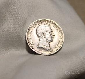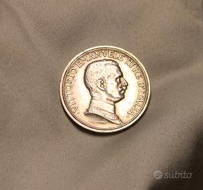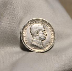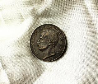 Nella facciata del dritto, la moneta presenta il profilo nudo del Re rivolto verso sinistra e contornato dalla scritta in stampatello maiuscolo “VITTORIO EMANUELE III RE D’ITALIA”. Sotto il collo, troviamo le firme dell’autore (D. Trentacoste) e dell’incisore (L. Giorgini).