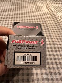 FullPower 2212M 980Kv motore brushless specifico per multirotori, cuscinetti di qualità giapponese, ottime finiture.Fornito completo di mozzo elica da Ø 5,0 mm, connettori dorati da 3,5 mm e cavi lunghi 45 cm, flangia di fissaggio.SPECIFICHE:- Tipo rotore: Cassa rotante- Tipo motore: Brushless- Diametro [mm]: 28- Lunghezza [mm]: 30- Senso di rotazione: CCW - Trattivo, CW - Propulsivo- Riduttore di giri: NO- Peso [g]: 62,5- Dimensioni statore [mm]: Ø 22x12- Giri/V: 980- Assorbimento [A]: 15- N. celle LiPo: 3, 4- Eliche: 8x3,8~10x4,7- Diametro asse [mm]: 5- Variatore (ESC): 20A- Utilizzo: Droni- Potenza [W]: 225