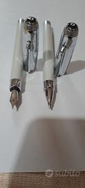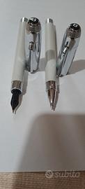 Bellissima penna stilografica e a sfera Graf Von Faber Castel nuove mai usate. Colore bianco perla con finiture cromate senza scatola originale soltanto con astuccio in pelle non originale.