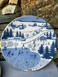 Arabia Finlandia: Anno 1981-1982 Piatti da parete annuale natalizio da collezione, motivo disegnato da Raija Uosikkinen, blu, bianco e oro