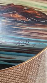 2 piatti ornamentali in ceramica dipinti a mano. Marca franco. Firma Michi Diametro: 28 cm. Con reggi piatti in legno. (Rita)