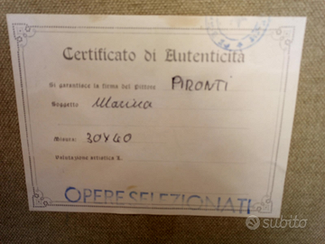 Per impreviste necessità metto in vendita queste due opere di pittori molto apprezzati dalla critica: G. CURTI e A. PIRONTI. Trattasi di 2 opere misura 30x40 cm. acquistate negli anni '60 e ottimamente conservate, come allora, corredate da certificazione di autenticità. La quotazione attuale si aggira sui 250-300 euro ciascuna. Possibile acquisto singolo.