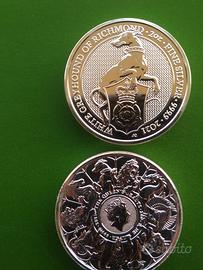 Le monete d'argento Queen's Beasts sono dedicate alle 10 maestose figure araldiche che nel corso dei secoli hanno rappresentato i casati inglesi sugli stemmi reali. Dieci statue in gesso raffiguranti le bestie hanno adornato l'evento di incoronazione della regina Regina Elisabetta II a Westminster Abbey nel 1953.