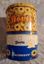 Due scatola latta biscotti doria spa Orsago Treviso vintage , buone condizioni , diametro 19cm , altezza 14 cm , Doria bucaneve