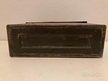 2 scatole in ferro porta munizioni la piu grande blu, la piu piccola riverniciata marrone era verde come si puo notare dal fondo Militari anni 80