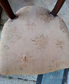 2 sedie antiche, stile Luigi Filippo, risalenti all'800. Il telaio è in legno di noce, mentre la seduta è in tessuto beige con un delicato motivo floreale. Sono in buone condizioni generali, considerando la loro età, mostrando segni del tempo che ne accrescono il fascino. Seduta da ripristinare
