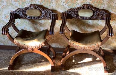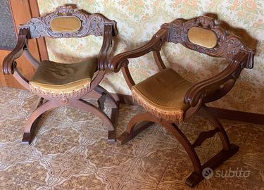 Coppia di sedie tipo Savonarola (stile rinascimentale) in legno massello lavorato e intarsiato e con seduta imbottita color senape.