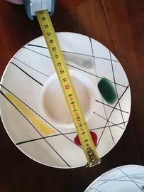 Vintage 1930-50 dell' industria ceramica vicentina. art decò. due tazze da cioccolata e piattino con alta base cilindrica, realizzata per favorire l’alloggiamento della tazzina (cosiddetta tazza a trembleuse, usata per servire la cioccolata; per evitare che si addensasse era necessario un continuo movimento circolatorio e la forma della trembleuse impediva alla tazza di scivolare). Difetti in foto