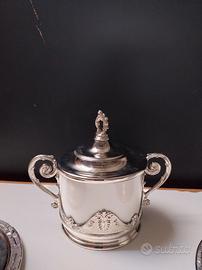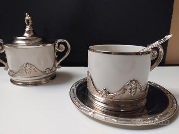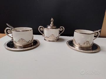 cofanetto con 2 tazzeda the, cucchiaini e zuccheriera, argento e porcellana Weidmann. Nuove, mai usate.