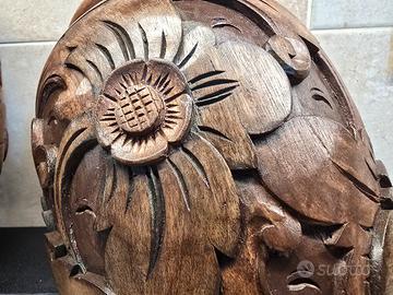 Il cuore di questi vasi è l'intaglio profondo e dettagliato: un rigoglioso motivo floreale e vegetale avvolge l'intera circonferenza di entrambi i vasi, creando un rilievo tattile e visivo di grande impatto. Il legno è stato trattato con un mordente scuro che esalta la profondità dell'intaglio e il calore naturale del materiale.