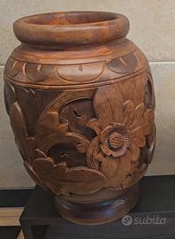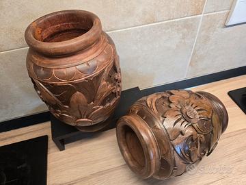 Incredibile coppia di vasi decorativi scultorei, realizzati in legno massiccio e interamente intagliati a mano. Si tratta di due pezzi artigianali unici, perfetti per amanti dell'arredamento materico, Boho, Rustico Elegante o Etnico Chic.