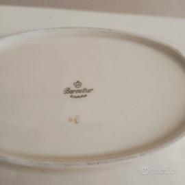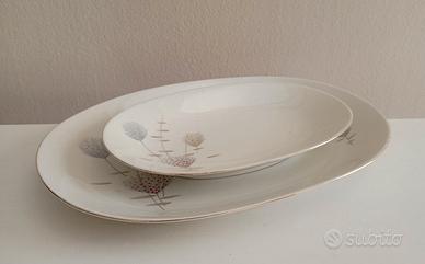 Due vassoi da portata realizzati in fine porcellana dalla rinomata manifattura tedesca Bareuther Bavaria. Perfetti per chi ama lo stile vintage e il modernariato degli anni '50/'60. Presentano una delicata e stilizzata fantasia floreale/botanica, tipica del design d'epoca, con sfumature di blu/lilla, grigio e rosa. Questi vassoi sono ideali non solo per servire arrosti, contorni, dolci o formaggi durante cene speciali, ma anche come: